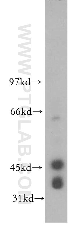 - Human testis tissue were subjected to SDS PAGE followed by western blot with 15346-1-AP (CKMT1A antibody) at dilution of 1:300 incubated at room temperature for 1.5 hours.