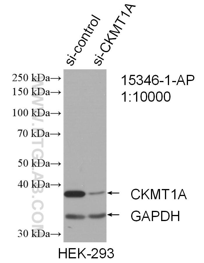 - WB result of CKMT1A antibody (15346-1-AP; 1:10000; incubated at room temperature for 1.5 hours) with sh-Control and sh-CKMT1A transfected HEK-293 cells.