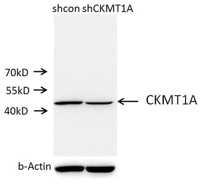 - A549 cells (shcontrol and shRNA of CKMT1A) were subjected to SDS PAGE followed by western blot with 15346-1-AP (CKMT1A antibody) at dilution of 1:30.