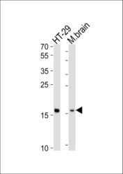 - "Western blot analysis of lysates from HT-29 cell line, mouse brain tissue lysate (from left to right), using TMEM160 Antibody (N-term)(Cat. #AP21058a). AP21058a was diluted at 1:1000 at each lane. A goat anti-rabbit IgG H&L(HRP) at 1:10000 dilution was used as the secondary antibody. Lysates at 20ug per lane."