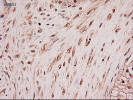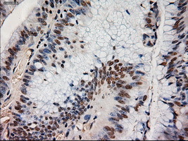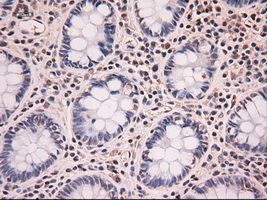 - Immunohistochemical staining of paraffin-embedded colon using anti-NTF4 mouse monoclonal antibody.