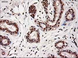 - Immunohistochemical staining of paraffin-embedded breast using anti-NTF4 mouse monoclonal antibody.