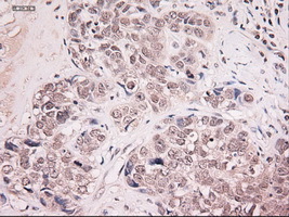 - Immunohistochemical staining of paraffin-embedded Adenocarcinoma of breast using anti-NTF4 mouse monoclonal antibody.