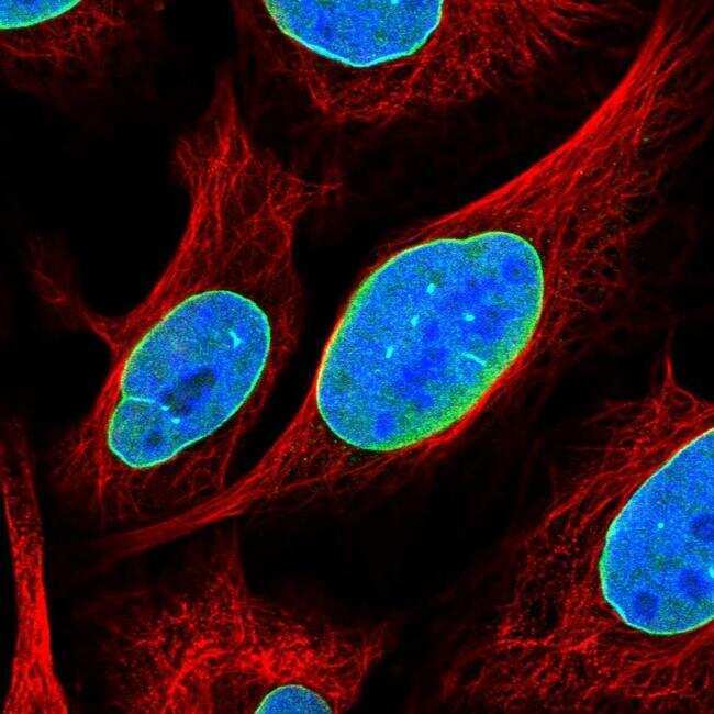 - Immunofluorecent analysis of C6orf141 in human cell line U-2 OS using C6orf141 Polyclonal Antibody (Product # PA5-57569). Staining shows localization to nuclear membrane.