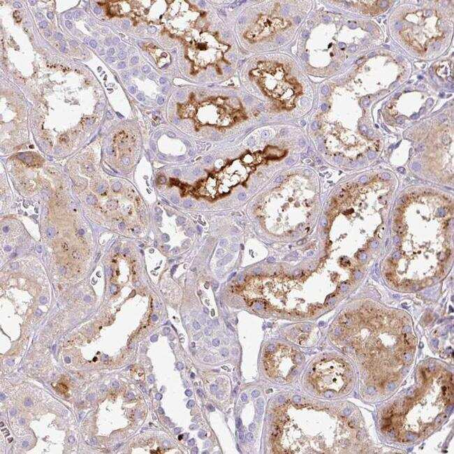 - Immunohistochemical analysis of CTXN2 in human kidney using CTXN2 Polyclonal Antibody (Product # PA5-62749) shows strong membranous and cytoplasmic positivity in subset of cells in tubules.