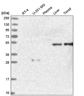 - Western Blot: Atherin Antibody [NBP2-58972] - Western blot analysis in human cell line RT-4, human cell line U-251 MG, human plasma, human liver tissue and human tonsil tissue.