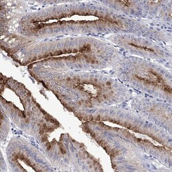 - Immunohistochemical analysis of FER1L6 in human stomach using FER1L6 Polyclonal Antibody (Product # PA5-62925) shows strong membranous positivity in glandular cells.
