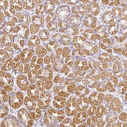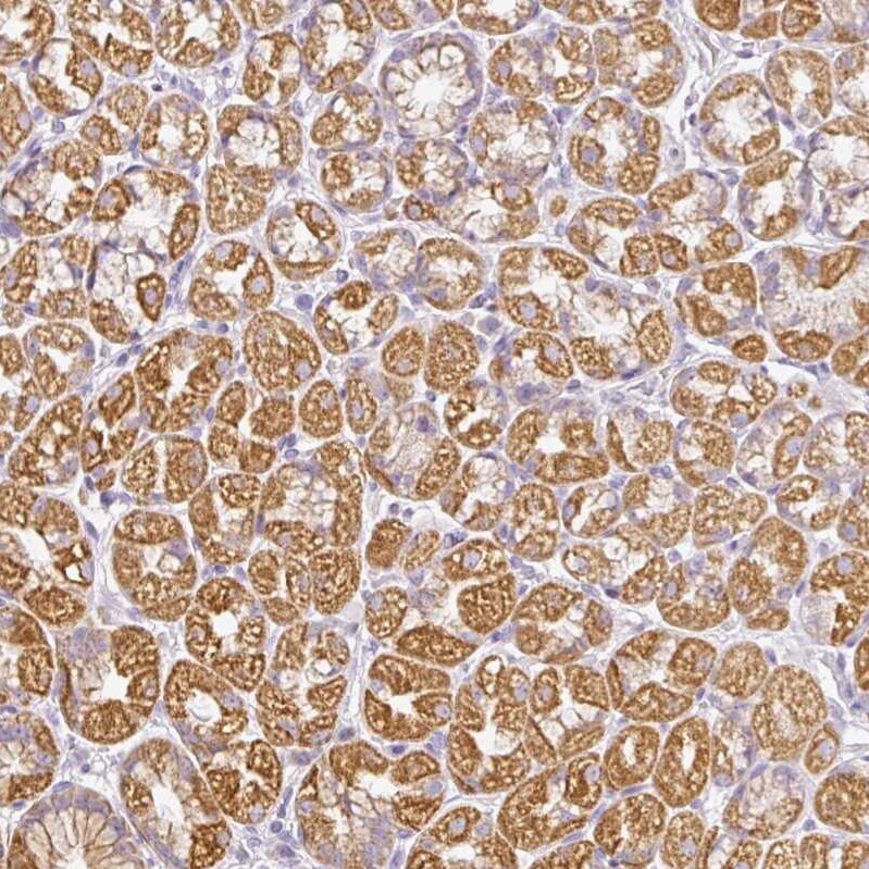 - Immunohistochemical analysis of Hemicentin 2 in human stomach using Hemicentin 2 Polyclonal Antibody (Product # PA5-62868) shows moderate cytoplasmic granular positivity in glandular cells.