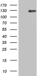 - HEK293T cells were transfected with the pCMV6-ENTRY control (Left lane) or pCMV6-ENTRY DACT1 (RC212564, Right lane) cDNA for 48 hrs and lysed. Equivalent amounts of cell lysates (5 µg per lane) were separated by SDS-PAGE and immunoblotted with anti-DACT1. (1:2000)