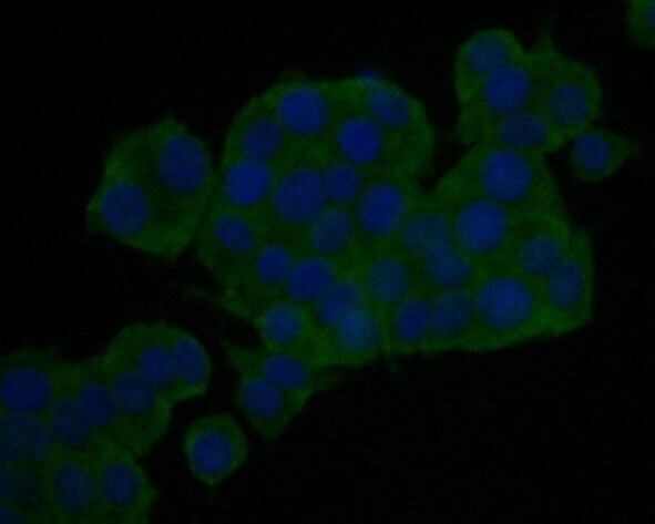 - Immunocytochemical analysis of KIDINS220 in PC-12 cells using a KIDINS220 polyclonal antibody (Product #PA5-116475). Formalin fixed cells, as seen in green, were permeabilized with 0.1% Triton X-100 in TBS for 10 minutes at room temperature and blocked with 1% Blocker BSA for 15 minutes at room temperature. Cells were probed with the primary antibody ( 1:200) for 1 hour at room temperature, washed with PBS. Alexa Fluor®488 Goat anti-Rabbit IgG was used as the secondary antibody at 1:1,000 dilution. The nuclear counter stain is DAPI (blue).