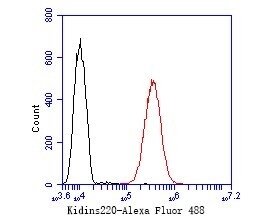 - Flow cytometric analysis of KIDINS220 in SH-SY5Y cells using a KIDINS220 polyclonal antibody (Product#PA5-116475). The cells were fixed, permeabilize, and stained with the primary antibody (1:50) (red). After incubation of the primary antibody at room temperature for an hour, the cells were stained with a Alexa Fluor 488-conjugated Goat anti-Rabbit IgG Secondary antibody at 1:1000 dilution for 30 minutes. The control was not incubated with the primary antibody (black).