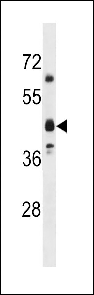 - OR5M8 Antibody (C-term) (Cat. #AP18932b) western blot analysis in MCF-7 cell line lysates (35ug/lane).This demonstrates the OR5M8 antibody detected the OR5M8 protein (arrow).