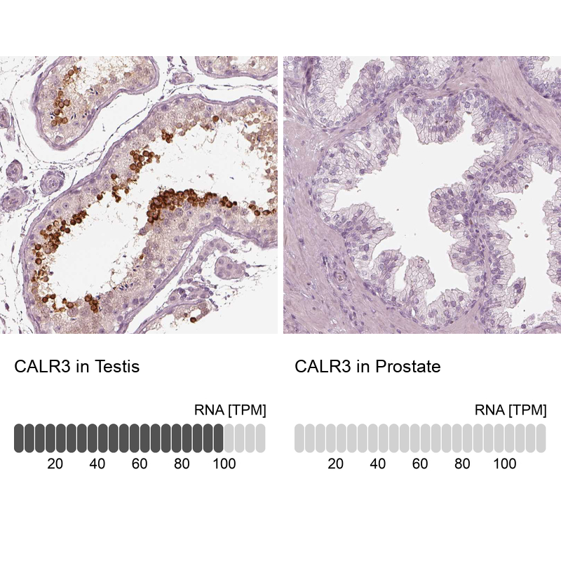 - Immunohistochemistry analysis in human testis and prostate tissues using HPA043355 antibody. Corresponding CALR3 RNA-seq data are presented for the same tissues.