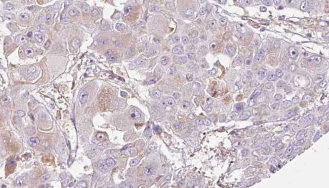 - 1:100 staining human liver carcinoma tissues by IHC-P. The sample was formaldehyde fixed and a heat mediated antigen retrieval step in citrate buffer was performed. The sample was then blocked and incubated with the antibody for 1.5 hours at 22°C. An HRP conjugated goat anti-rabbit antibody was used as the secondary.
