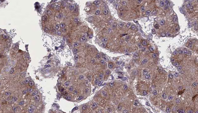 - 1:100 staining human liver carcinoma tissues by IHC-P. The sample was formaldehyde fixed and a heat mediated antigen retrieval step in citrate buffer was performed. The sample was then blocked and incubated with the antibody for 1.5 hours at 22°C. An HRP conjugated goat anti-rabbit antibody was used as the secondary.