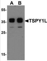 - Western blot analysis of TSPY1L in A20 cell lysate with TSPY1L antibody Cat.-No AP55517PU-N at (A) 0.5 and (B) 1 ?g/mL