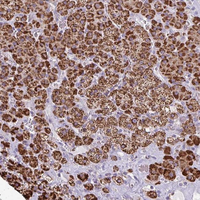 - Immunohistochemical staining of LCNL1 in human adrenal gland tissue shows strong granular cytoplasmic positivity in glandular cells. Samples were probed using a LCNL1 Polyclonal Antibody (Product # PA5-63829).
