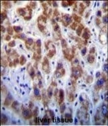 - Immunohistochemistry analysis of GOLGA8A in formalin fixed and paraffin embedded human liver tissue. Samples were incubated with GOLGA8A polyclonal antibody (Product # PA5-35036) followed by peroxidase conjugation of the secondary antibody and DAB staining. This data demonstrates the use of this antibody for immunohistochemistry. Clinical relevance has not been evaluated.