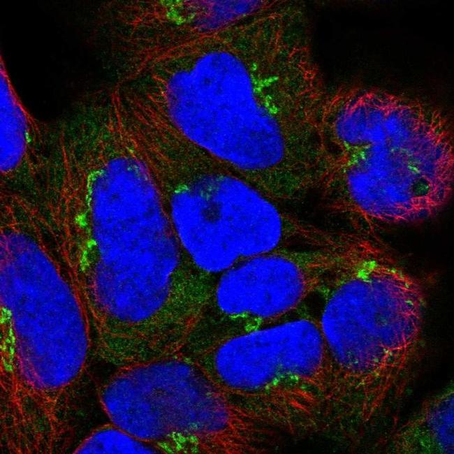 - Immunofluorescent staining of GOLGA8A in human cell line HEK 293 shows localization to cytosol and the Golgi apparatus. Samples were probed using a GOLGA8A Polyclonal Antibody (Product # PA5-65681).