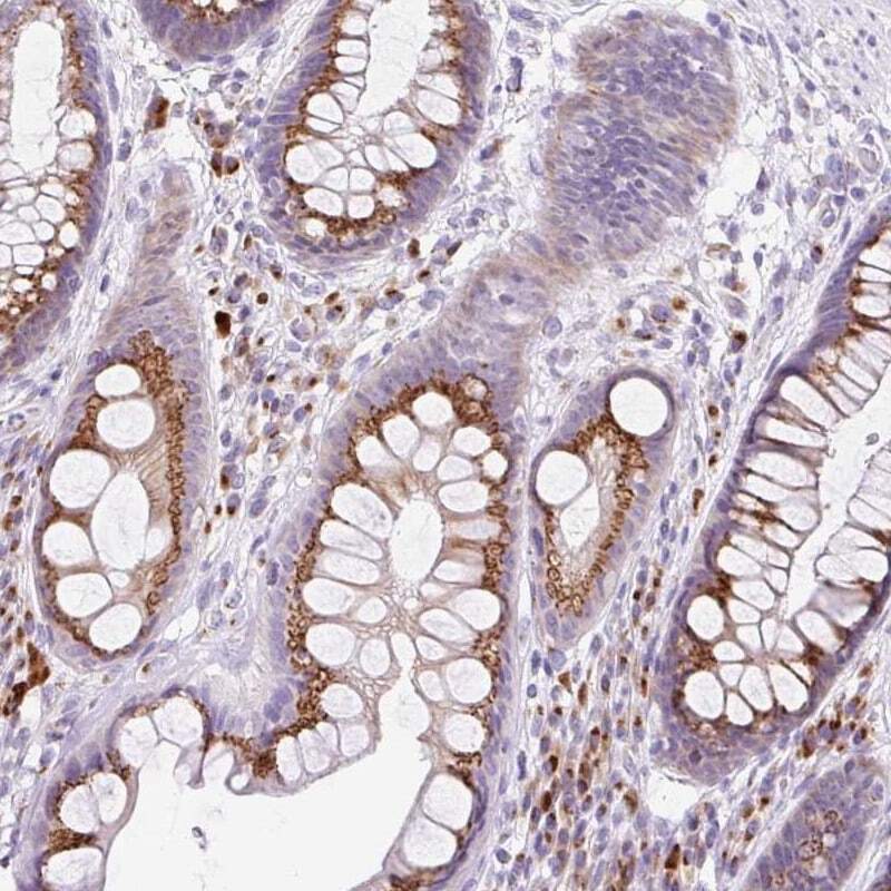 - Immunohistochemical staining of GOLGA8A in human rectum using GOLGA8A Polyclonal Antibody (Product # PA5-65681) shows strong cytoplasmic positivity in glandular cells.