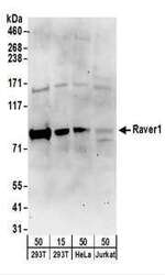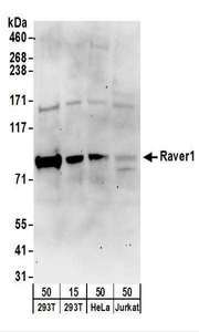 - Detection of Human Raver1 by Western Blot. Samples: Whole cell lysate from 293T (15 and 50 ug), HeLa (50 ug), and Jurkat (50 ug) cells. Antibodies: Affinity purified rabbit anti-Raver1 antibody used for WB at 1 ug/ml. Detection: Chemiluminescence with an exposure time of 3 minutes.