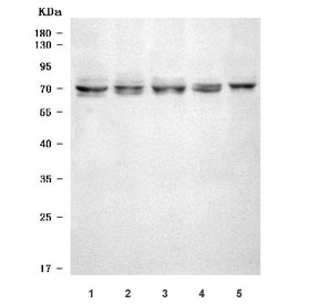- Western blot testing of 1) human HeLa, 2) rat testis, 3) rat C6, 4) mouse testis and 5) mouse NIH 3T3 cell lysate with SEL1L2 antibody. Predicted molecular weight ~78 kDa.