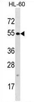 - TTC34 Antibody (C-term) western blot analysis in HL-60 cell line lysates (35 ug/lane). This demonstrates the TTC34 antibody detected the TTC34 protein (arrow).