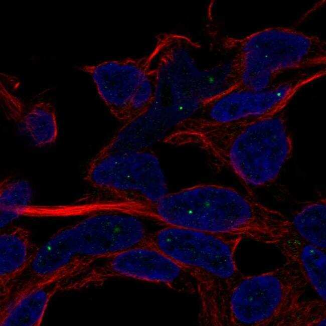 - Immunofluorescent staining of SERF1A in human cell line HEK 293 shows localization to nuclear bodies. Samples were probed using a SERF1A Polyclonal Antibody (Product # PA5-67379).