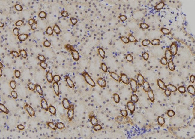 - 1:100 staining mouse kidney tissue by IHC-P. The sample was formaldehyde fixed and a heat mediated antigen retrieval step in citrate buffer was performed. The sample was then blocked and incubated with the antibody for 1.5 hours at 22°C. An HRP conjugated goat anti-rabbit antibody was used as the secondary.