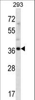 - ANKRD60 Antibody western blot of 293 cell line lysates (35 ug/lane). The ANKRD60 antibody detected the ANKRD60 protein (arrow).