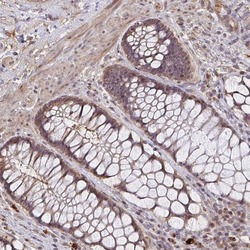 - Immunohistochemical analysis of ZNF805 in human rectum using ZNF805 Polyclonal Antibody (Product # PA5-63625) shows moderate cytoplasmic positivity in glandular cells.