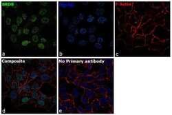 - For immunofluorescence analysis, HCT 116 cells were fixed and permeabilized for detection of endogenous BRD8 using Anti-BRD8 Recombinant Rabbit Monoclonal Antibody (Product # 702872, 1:100 dilution) and labeled with Goat anti-Rabbit IgG (H+L) Highly Cross-Adsorbed Secondary Antibody, Alexa Fluor Plus 488 conjugate (Product # A32731, 1:2000). Panel a) shows representative cells that were stained for detection and localization of BRD8 protein (green), Panel b) is stained for nuclei (blue) using ProLong™ Diamond Antifade Mountant with DAPI (Product # P36962). Panel c) represents cytoskeletal F-actin staining using Rhodamine Phalloidin (Product # R415, 1:300). Panel d) is a composite image of Panels a, b and c clearly demonstrating nuclear localization of BRD8. Panel e) represents control cells with no primary antibody to assess background. The images were captured at 60X magnification.