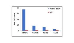 - Chromatin Immunoprecipitation (ChIP) assay of endogenous BRD8 protein using Anti-BRD8 Antibody: ChIP was performed using Anti-BRD8 Recombinant Rabbit Monoclonal Antibody (Product # 702872, 5 µg) on sheared chromatin from 2 million HCT116 cells using the MAGnify ChIP System kit (Product # 49-2024). Normal Rabbit IgG was used as a negative IP control. The purified DNA was analyzed by qPCR using primers binding to MMP13 and MMP2 transcriptional start site, GAPDH promoter and SAT2 satellite repeats. Data is presented as fold enrichment of the antibody signal versus the negative control IgG using the comparative CT method.