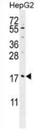 - Western blot analysis in HepG2 cell line lysates (35ug/lane) using MRFAP1L1 antibody . . This demonstrates this antibody detected the MRFAP1L1 protein (arrow).
