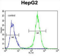 - Flow cytometric analysis of HepG2 cells (right histogram) compared to a negative control cell (left histogram) using MRFAP1L1 antibody . , followed by FITC-conjugated goat-anti-rabbit secondary antibodies.