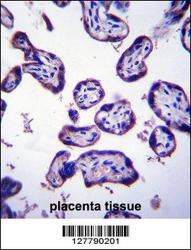 - TM4SF18 Antibody (Center) (Cat. #OAAB10626)immunohistochemistry analysis in formalin fixed and paraffin embedded human placenta tissue followed by peroxidase conjugation of the secondary antibody and DAB staining.This data demonstrates the use of TM4SF18 Antibody (Center) for immunohistochemistry. Clinical relevance has not been evaluated.