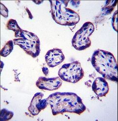 - TM4SF18 Antibody immunohistochemistry of formalin-fixed and paraffin-embedded human placenta tissue followed by peroxidase-conjugated secondary antibody and DAB staining.