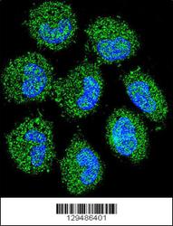 - Confocal immunofluorescent analysis of PRAMEF6 Antibody (C-term)(Cat#OAAB07662) with NCI-H460 cell followed by Alexa Fluor 488-conjugated goat anti-rabbit lgG (green). DAPI was used to stain the cell nuclear (blue).