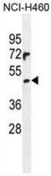 - PRAMEF6 Antibody (C-term) western blot analysis in NCI-H460 cell line lysates (35ug/lane).This demonstrates the PRAMEF6 antibody detected the PRAMEF6 protein (arrow).
