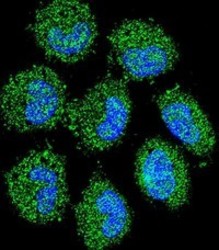 - Confocal immunofluorescent analysis of PRAMEF6 Antibody (C-term) with NCI-H460 cell followed by Alexa Fluor 488-conjugated goat anti-rabbit lgG (green). DAPI was used to stain the cell nuclear (blue).