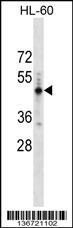 - PRAMEF14 Antibody (Center) (Cat. #AP16992c) western blot analysis in HL-60 cell line lysates (35ug/lane).This demonstrates the PRAMEF14 antibody detected the PRAMEF14 protein (arrow).