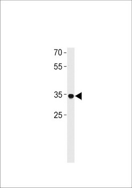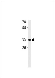 - RHOXF2B Antibody (Center) (Cat. #TA324664) western blot analysis in A549 cell line lysates (35ug/lane).This demonstrates the RHOXF2B antibody detected the RHOXF2B protein (arrow).