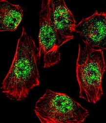 - IF image of A549 cell stained with RHOXF2B Antibody (Center)(Cat#TA324664).A549 cells were incubated with RHOXF2B primary antibody (1:25, 1 h at 37?). For secondary antibody, Alexa Fluor? 488 conjugated donkey anti-rabbit antibody (green) was used (1:400).Cytoplasmic actin was counterstained with Alexa Fluor? 555 (red) conjugated Phalloidin (7 units/ml). Nuclei were counterstained with DAPI (blue) .RHOXF2B immunoreactivity is localized to Nucleus significantly.