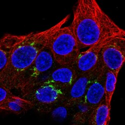 - Immunofluorescent staining of human cell line Hep G2 shows localization to the Golgi apparatus.