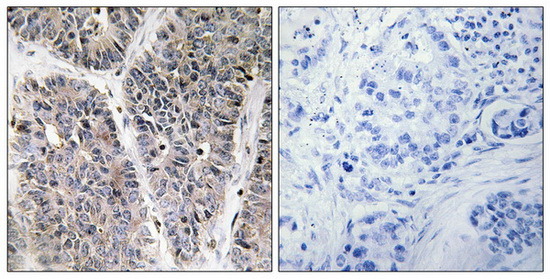 - Immunohistochemistry analysis of paraffin-embedded human lung carcinoma tissue using NBL1 antibody. The picture on the right is treated with the synthesized peptide.