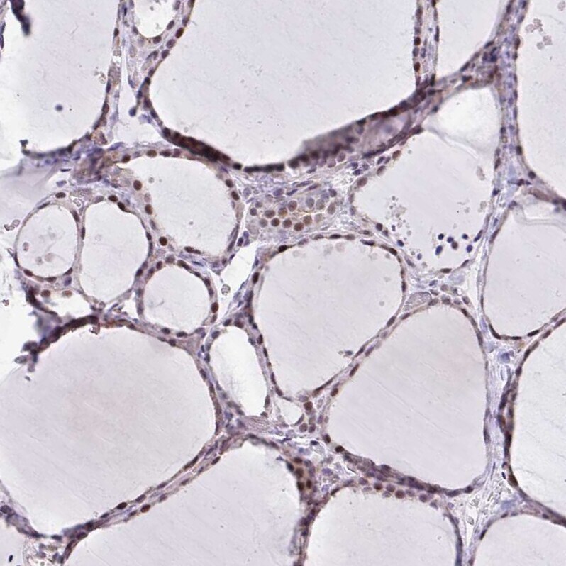- Immunohistochemical staining of WDR72 in human thyroid gland using WDR72 Polyclonal Antibody (Product # PA5-63438) shows moderate to strong nuclear positivity in follicular cells.