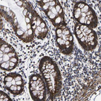 - Immunohistochemical staining of human rectum with PPAN-P2RY11 polyclonal antibody (Cat # PAB28230) shows strong granular cytoplasmic positivity in glandular cells at 1:50-1:200 dilution.