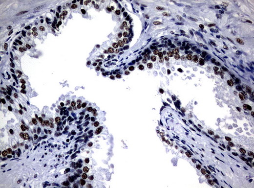 - Immunohistochemical staining of paraffin-embedded Human prostate tissue using anti-NBN mouse monoclonal antibody. (UM800030; heat-induced epitope retrieval by 10mM citric buffer, pH6.0, 120C for 3min)