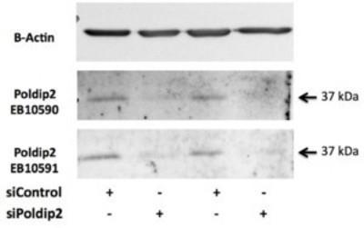- Western Blot: POLDIP2 Antibody [NBP1-68874] - (0.5ug/ml) Analysis of Rat VSMC lysate (35ug protein in RIPA buffer). Primary incubation was overnight at 4C. Detected by chemiluminescence. Data provided Dr. B. Lassegue, Emory University, Atlanta, USA