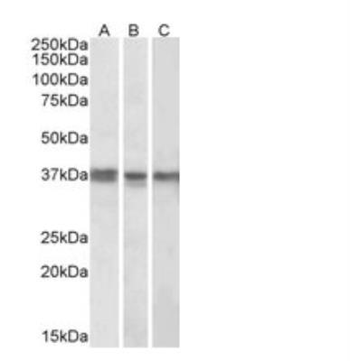 - Western Blot: POLDIP2 Antibody [NBP1-68874] - Staining of K562 (A), MCF7 (B) and Mouse Liver (C) lysates (35ug protein in RIPA buffer). Primary incubation was overnight at 4C. Detected by chemiluminescence.